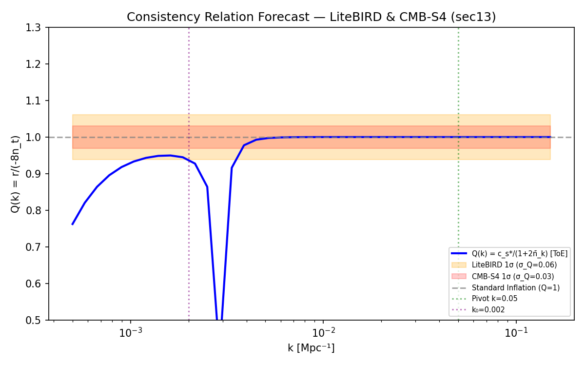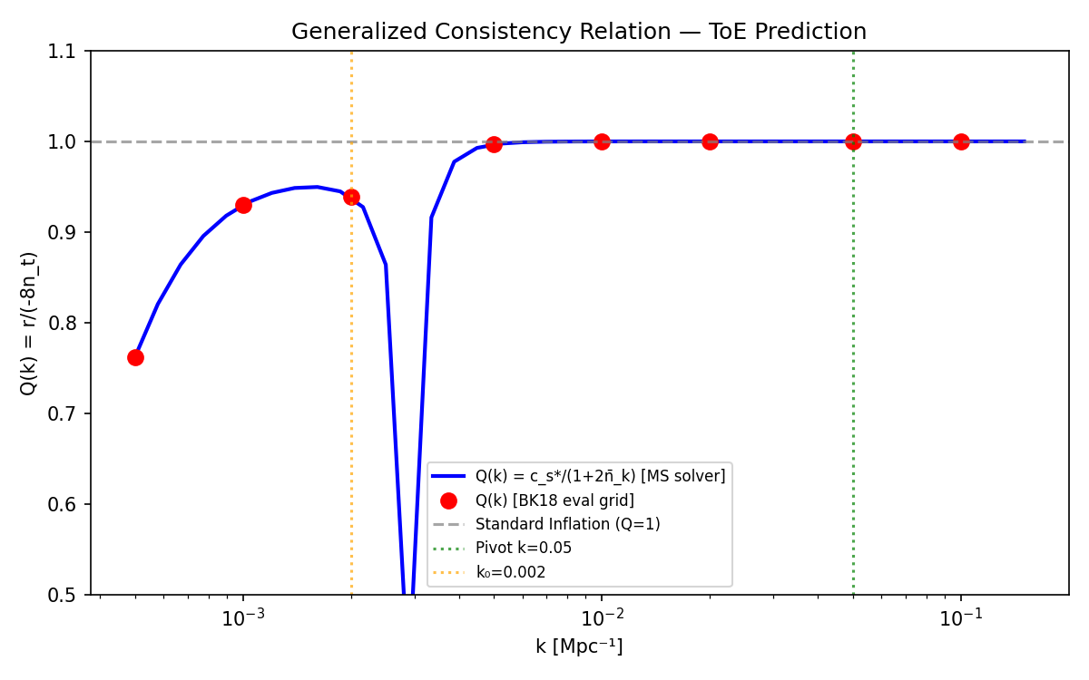 The ToE decoherence mechanism modifies the inflationary consistency relation from Q=1 (standard inflation) to Q(k)=cs∗/(1+2nˉk)<1 at scales k≲k0, with: