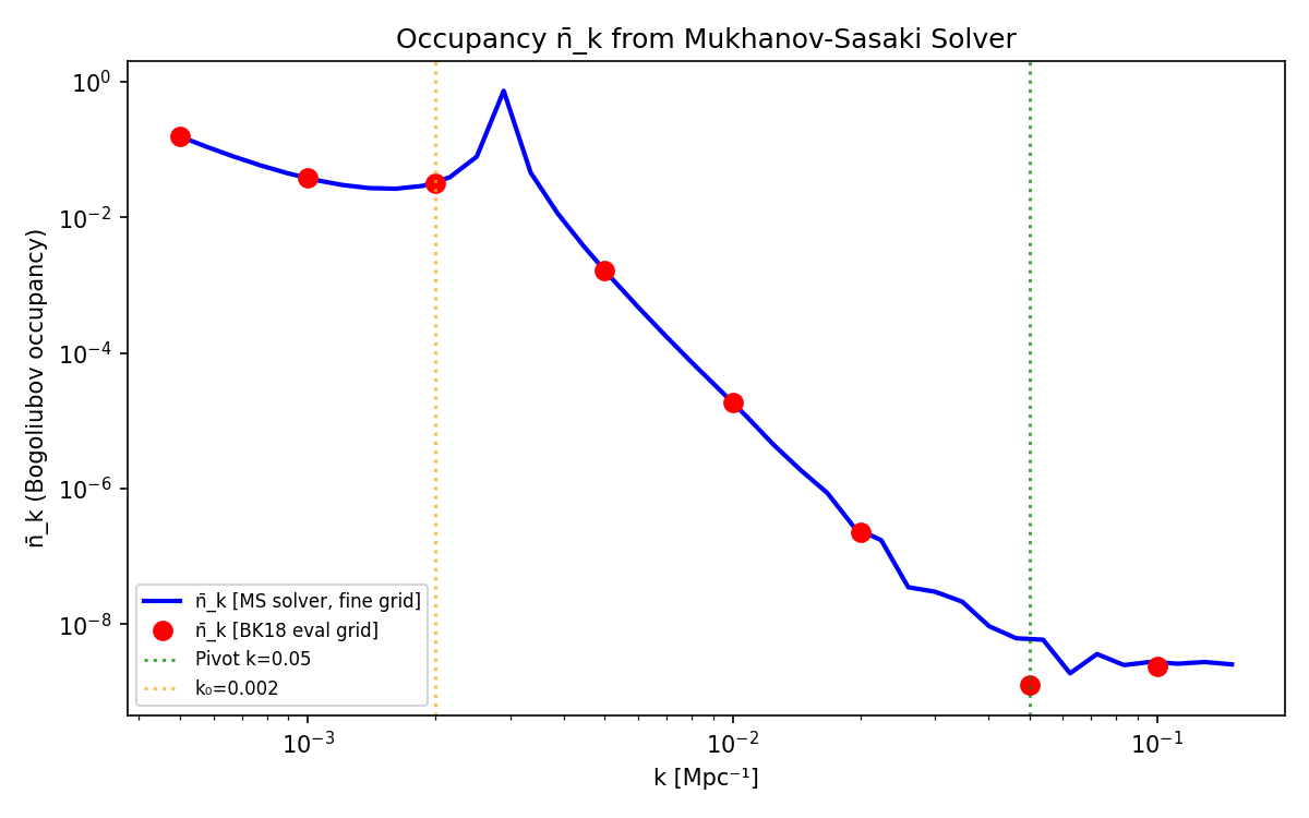 The Mukhanov–Sasaki solver computes nˉk by numerically evolving the mode equation through η0 and extracting βk via Bogoliubov matching. The decoherence scale k0 sets η0=−1/k0; modes with k≲k0 were super-horizon at η0 and acquire nonzero occupancy.
