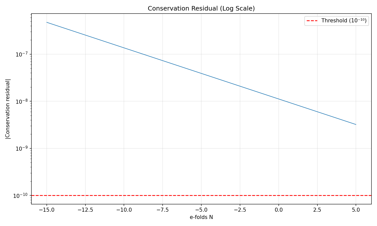 ![Fig. 1: Conservation residual |C(N)| across the grid N ∈ [−15, 5] (log scale). The residual remains below the 10⁻¹⁰ threshold everywhere.](https://dtrrls61m6wzc.cloudfront.net/static/claims/exp04_conservation_law/plots/conservation_residual_log.png)