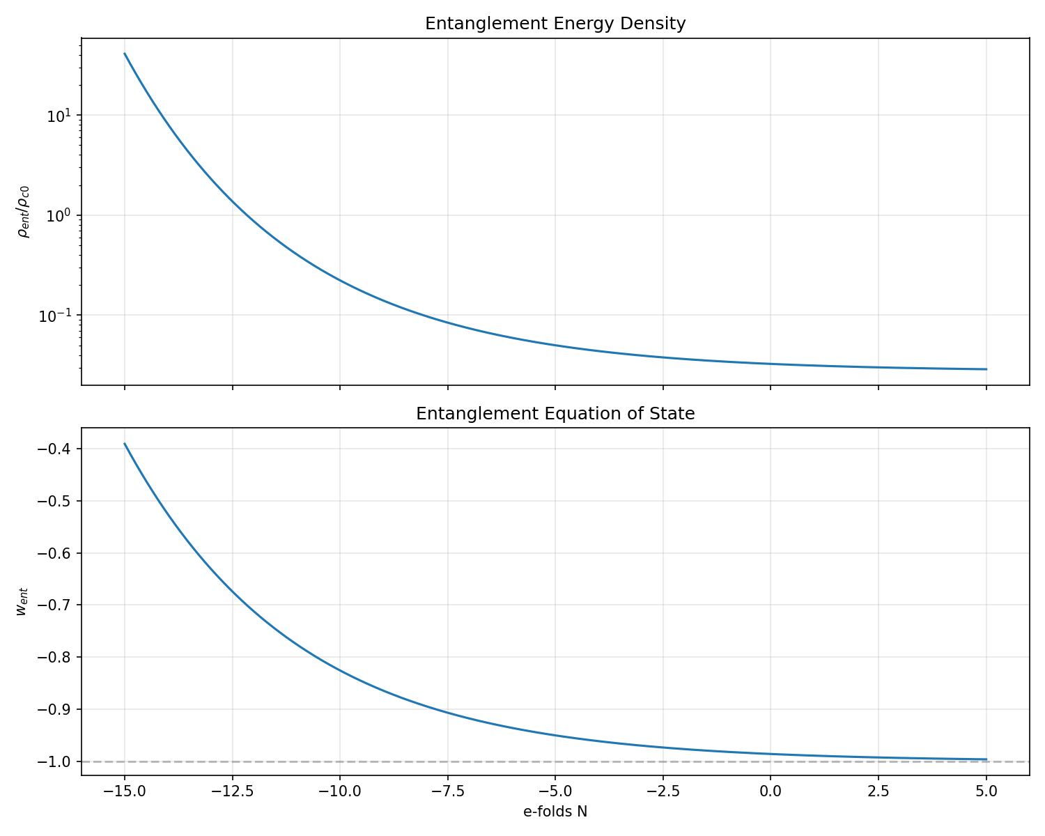 The entanglement fluid equation of state went(N) ranges from −0.999 (nearly cosmological-constant-like) to −0.878 (transient deviation during the decoherence epoch). The energy density ρent remains sub-dominant throughout, consistent with the small Ωent0=0.001 initial condition.