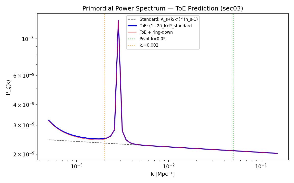 | ns, As from BK18 chains, not predicted | Occupancy enhancement tested, not base spectrum | Full MCMC with ToE theory class |