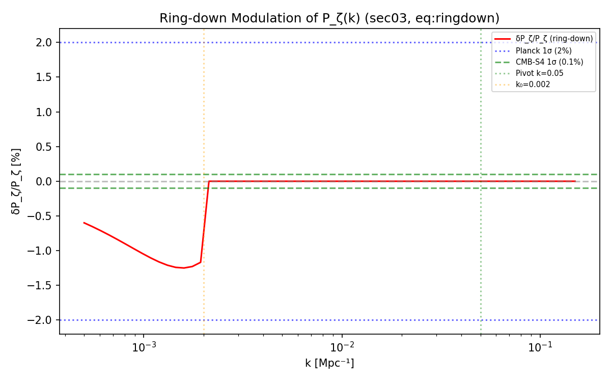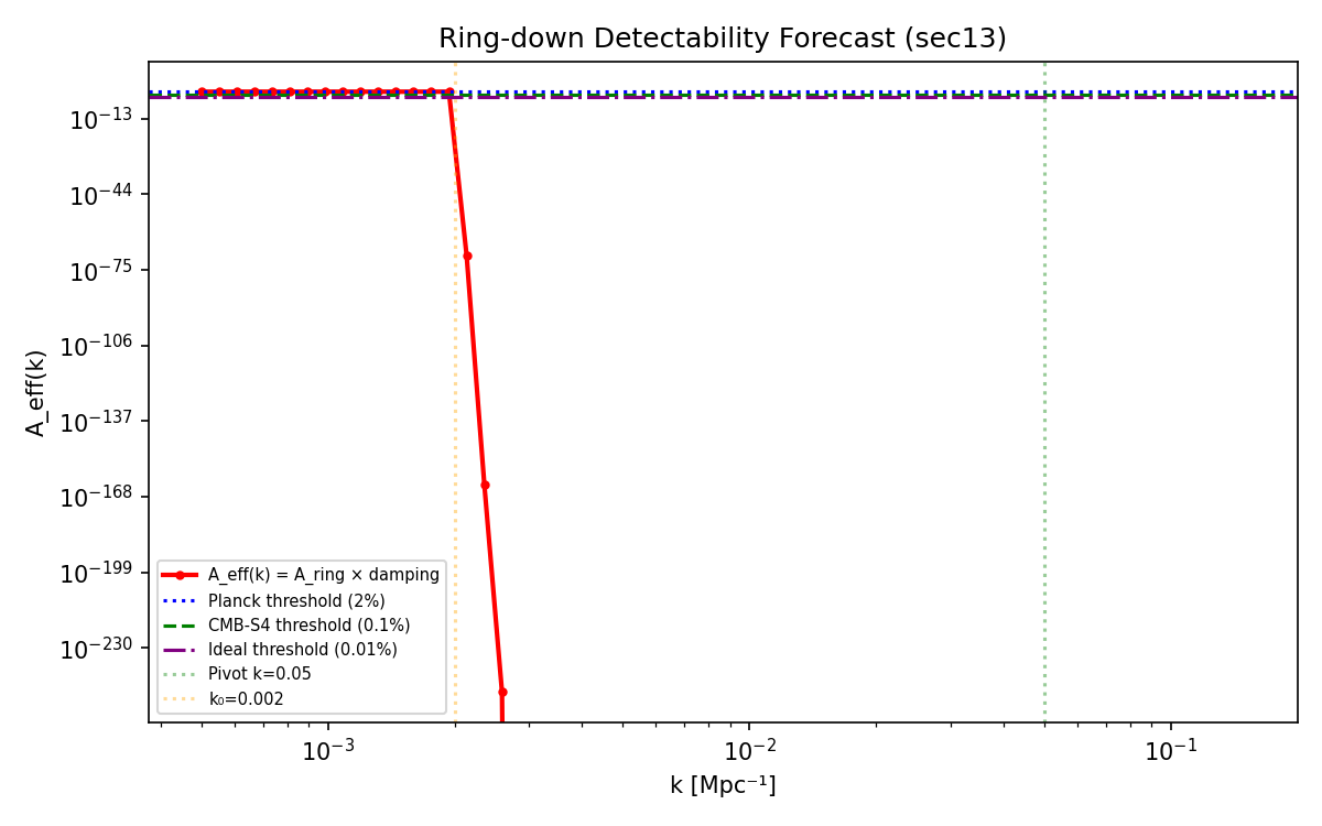 Quantitative forecast. Naive per-mode SNR = 12.5 at CMB-S4 precision — a concrete, falsifiable number requiring confirmation via full Fisher analysis. If CMB-S4 achieves 0.1% fractional precision on Pζ(k) and no ring-down is detected, the ToE decoherence mechanism is ruled out.
