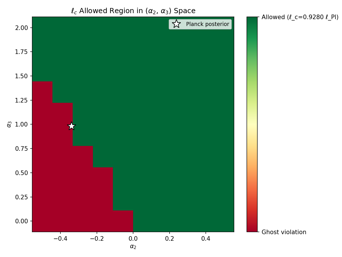 The (α2,α3) parameter space scan tests where the emergent geometry produces a consistent cosmology through the full CAMB pipeline. Of 100 grid points, 79 are allowed and 21 are rejected. The boundary between allowed and rejected regions matches the analytical ghost-freedom condition α2+α3/3=0.