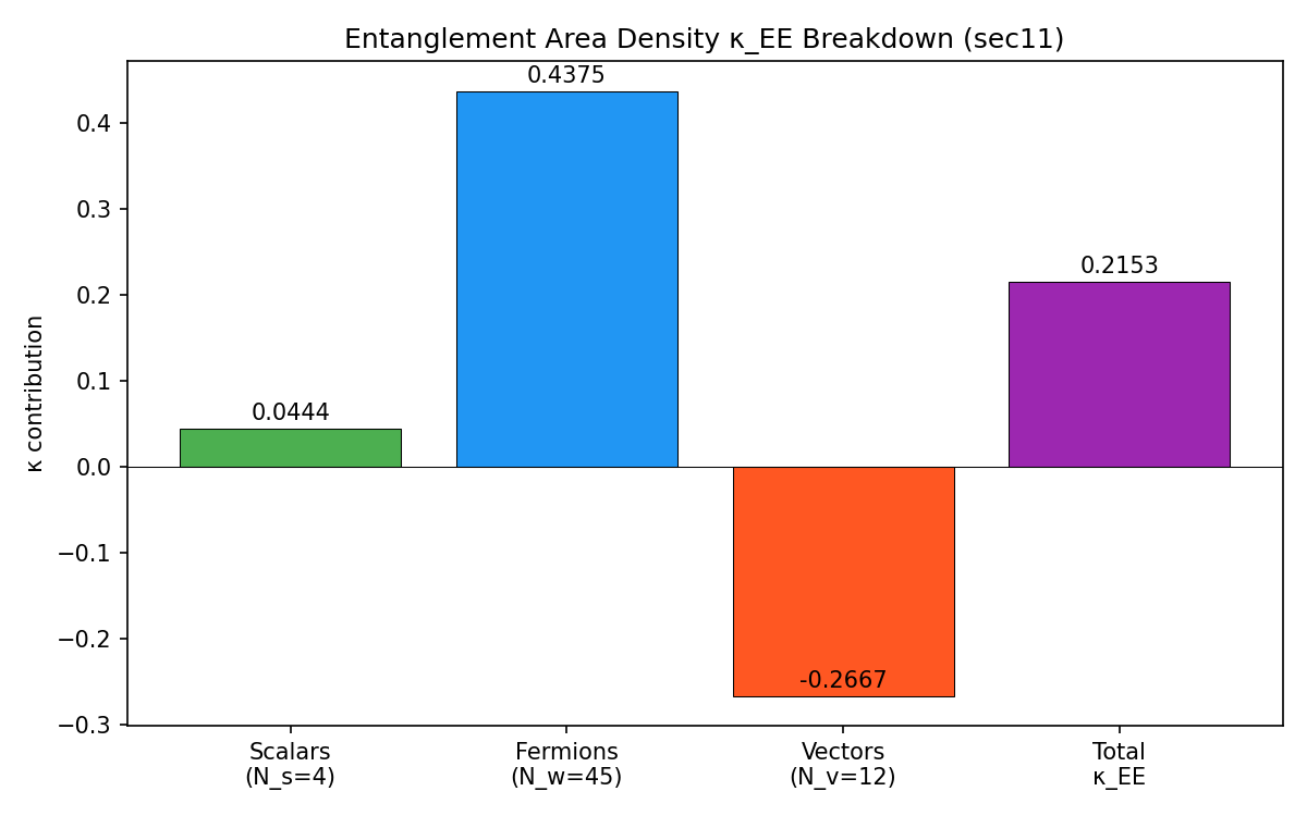 run_toe_calculation(DEFAULT_COBAYA_PARAMS) → H0=67.66 km/s/Mpccompute_ms_nbar() → nˉk∈[10−9,0.39], physicalThe entanglement area density receives contributions from three spin sectors. Fermions dominate (+0.438), scalars contribute modestly (+0.044), and gauge vectors subtract (−0.267) due to the ghost subtraction in the gauge-fixed path integral. The total κEE=0.215 is a fixed number determined entirely by the SM spectrum.